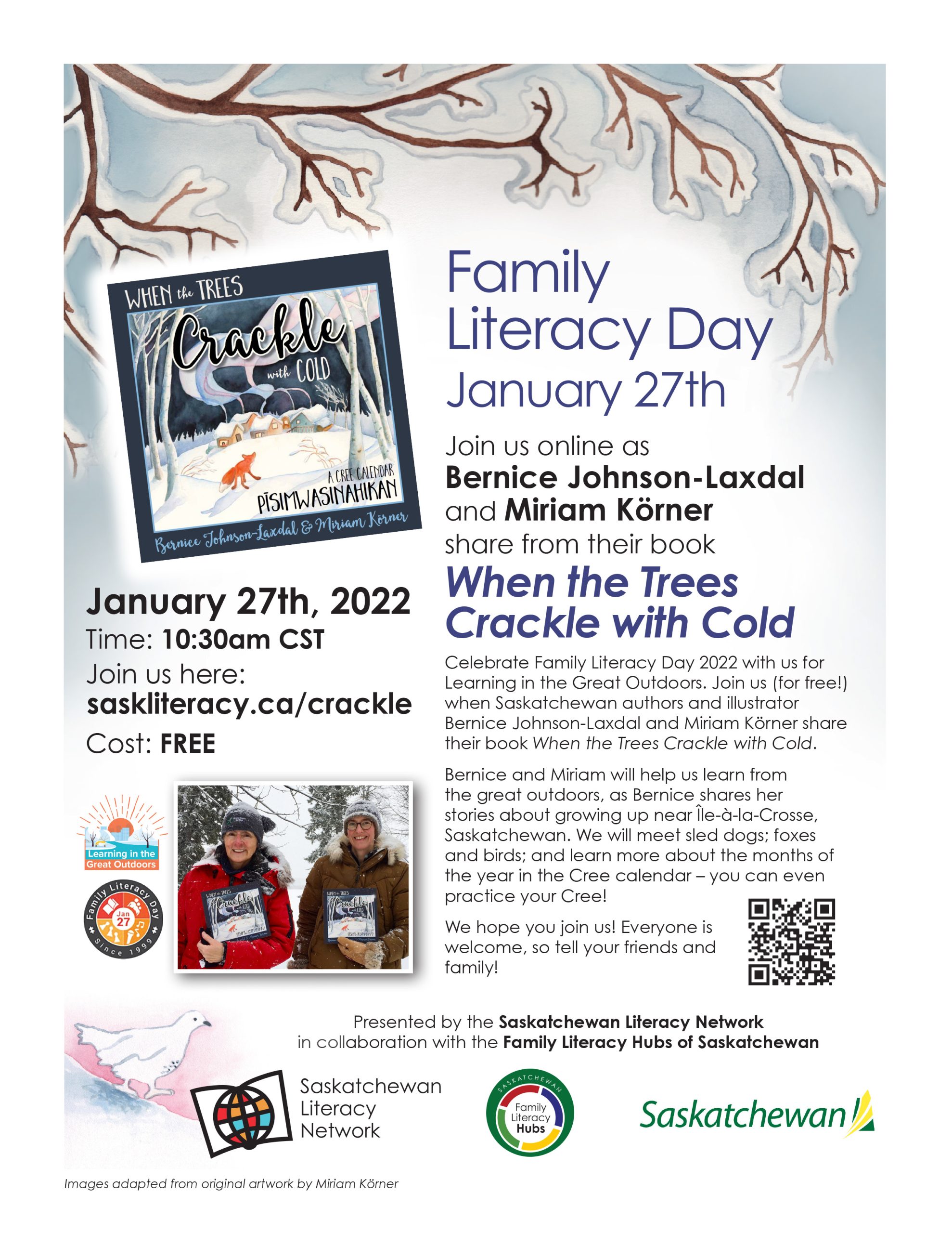 For Family Literacy Day 2022, ABC Life Literacy Canada set the national theme as “Learning in the Great Outdoors,” so we chose a book and stories about learning from the land in Saskatchewan: “When the Trees Crackle with Cold: A Cree Calendar”!
